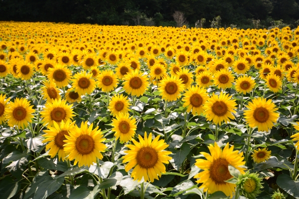 約6万5000平方メートルの広大な花畑いっぱいに60品種のひまわりたちが彩り豊かな夏の風景を作り出します。