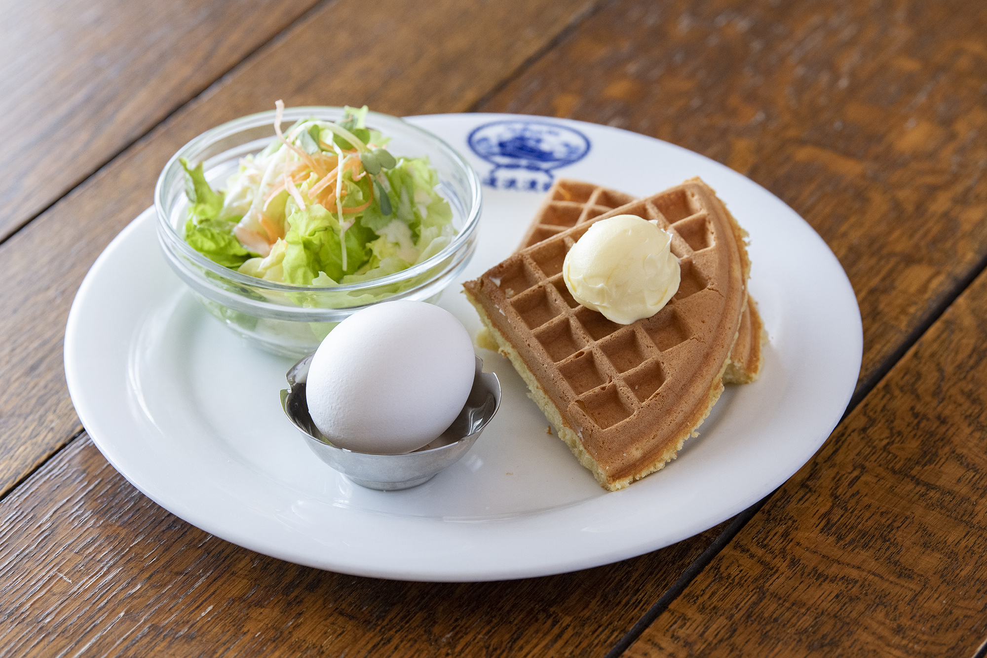 昼からのティータイムには、ふんわりサクッと焼き上げたワッフルにバターとメープルシロップ。