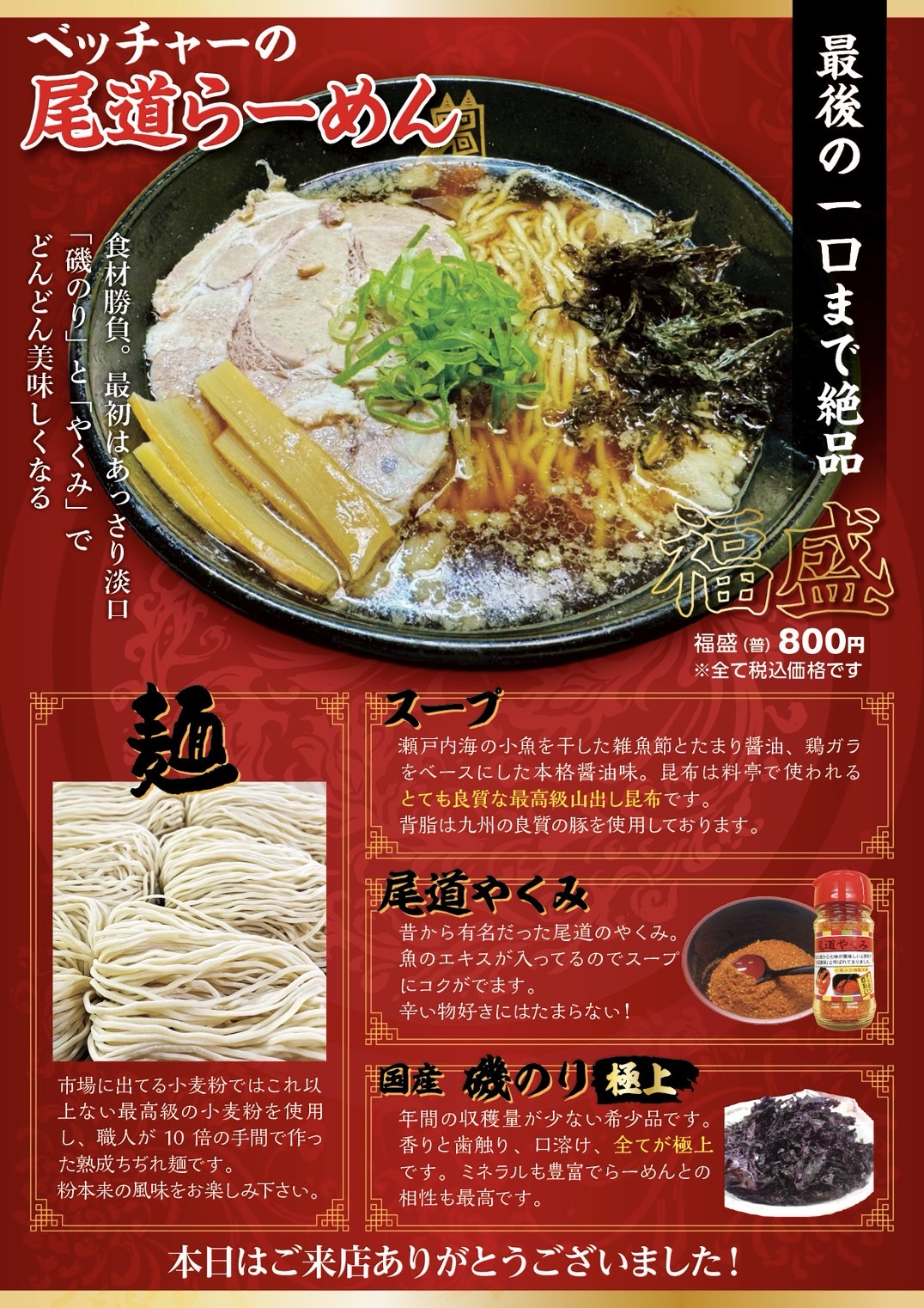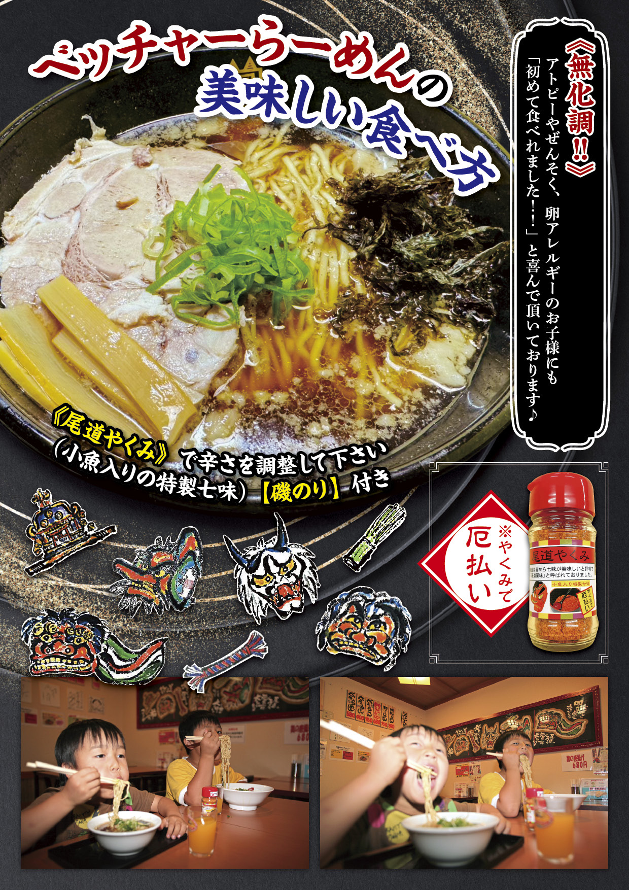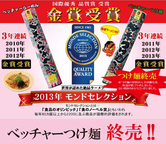 このお店のらーめんはベッチャー祭が行われる尾道・一宮神社で祈願して頂いた大変珍しいもので、TV・新聞・雑誌にもたびたび登場しています。