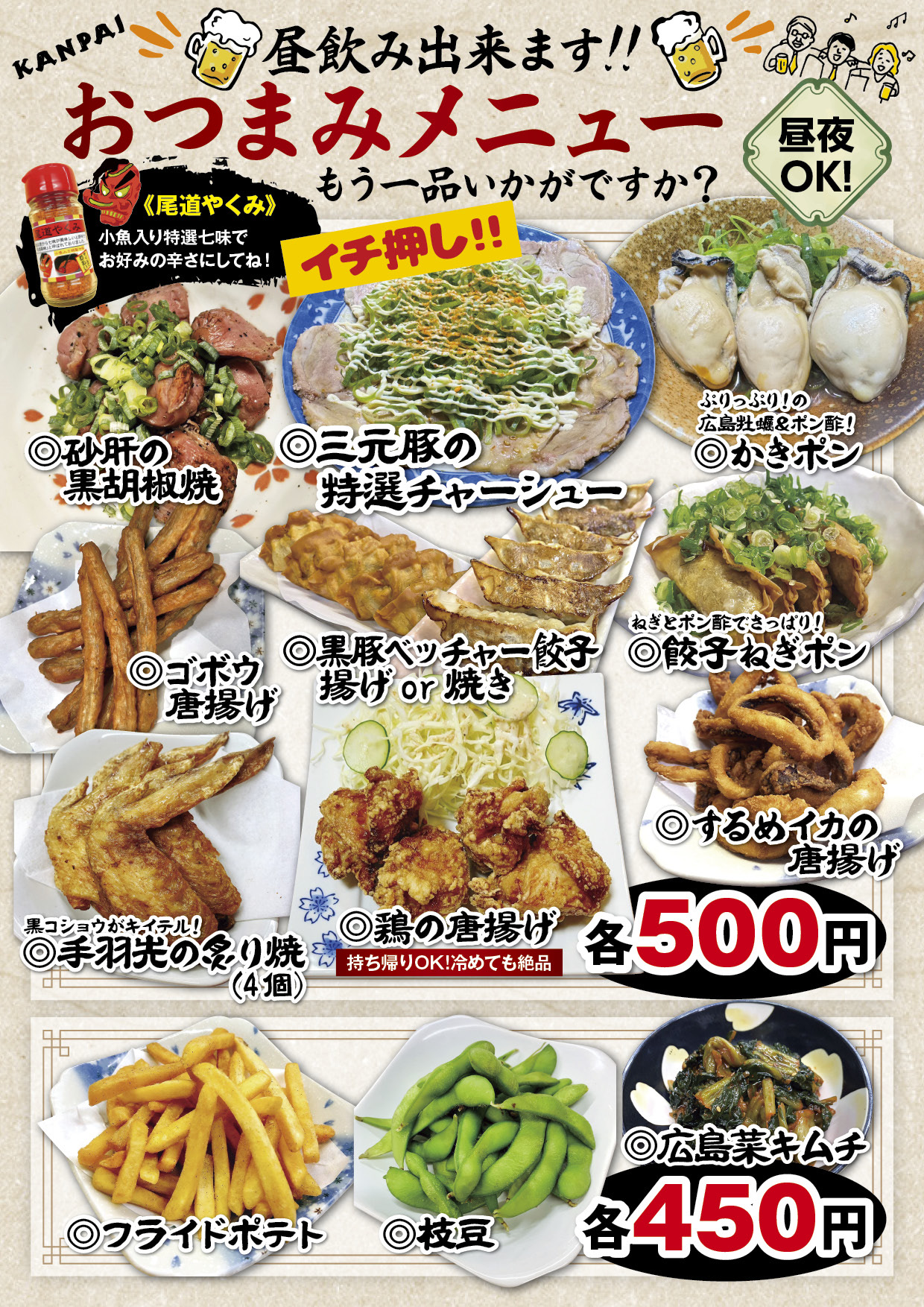 磯のりをのせ小魚の入った特製七味「尾道やくみ」でお好みの辛さでお召し上がりください。