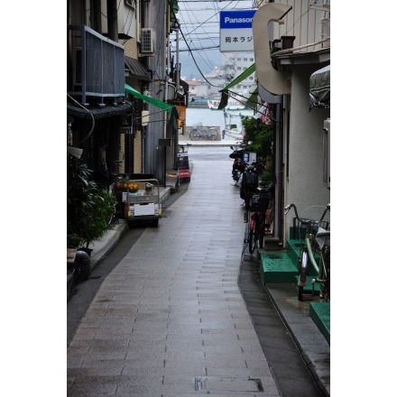 しっとりと濡れた小路の向こうには渡船が行き交います。