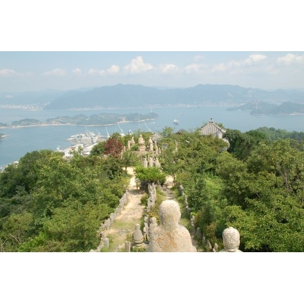 この山の頂上には石で作られた五百羅漢が所狭しと安置されていて、展望台から360度のしまなみビューを楽しむことができます。