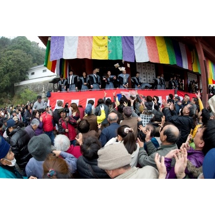 西國寺節分会で歳男らによって豆や餅が投げられている様子です。