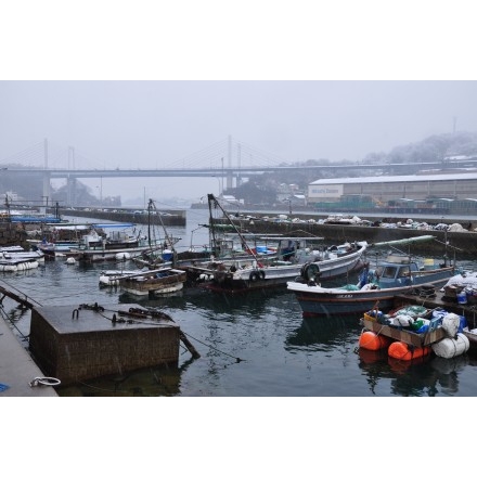 雪が舞う尾崎漁港からしまなみ海道新尾道方向を見た風景です。雪で橋が霞んでいます。