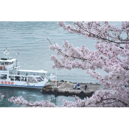 向島の兼吉の丘から見た桜と尾道渡船です。
