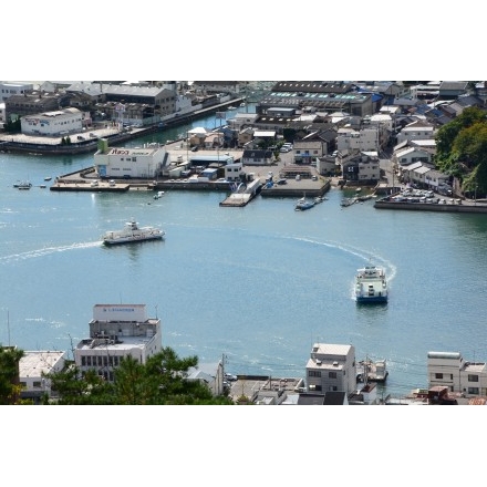 千光寺公園頂上展望台から見た、尾道水道を行き交う渡船です。写真は尾道渡船です。