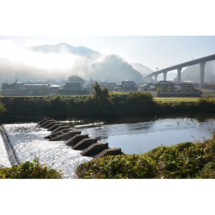 秋の御調の風景。御調川を飛び立つカワウや朝霧に包まれた山々が見えています。右上は尾道松江道の高架です。