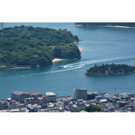 手前は因島土生地区、その沖に浮かぶ島々の間を縫うように旅客船が行き交っています。
