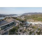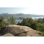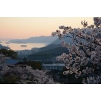 中央下は尾道市立美術館で、夕日が尾道水道の延長線上沈んでいく様子が見えています。