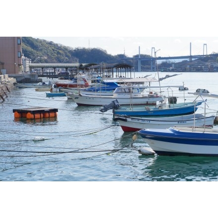 尾道水道の春風景。穏やかな水面に漁船たちが静かに揺れています。