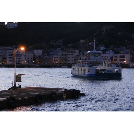 夏の午後7時、向島に帰宅する人々を乗せた渡船がやってきました。