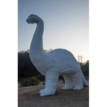 因島アメニティ公園に設置されている恐竜のオブジェ「ザウルくん」です。奥には朝日を浴びるしまなみ海道因島大橋の主塔が見えています。