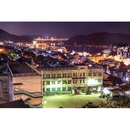旧土堂小学校越しに見る尾道の夜景です。尾道水道やしまなみ海道新尾道大橋なども見えています。