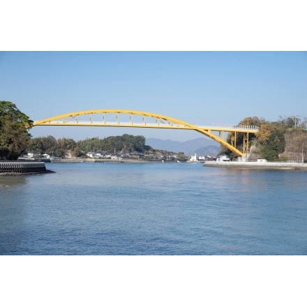 瀬戸田水道に架かる高根大橋です。この橋は生口島と高根島とを結ぶアーチ橋で、柑橘色をしています。