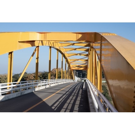 瀬戸田水道に架かる高根大橋です。この橋は生口島と高根島とを結ぶアーチ橋で、柑橘色をしています。手前が高根島、奥が生口島です。
