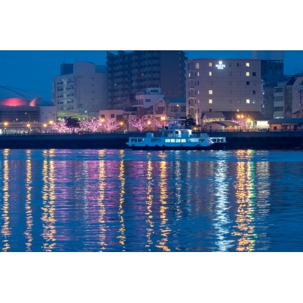 行き交う福本渡船やウィンターイルミネーション、尾道駅周辺の街並みなどが見えています。