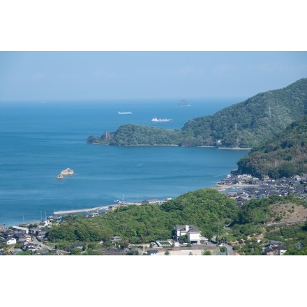白滝山に祀られている重岩石鎚大権現から見る風景です。因島大浜町の街並みの奥の白い島は八重子島、右上の小さな三角の島は愛媛県の百貫島です。