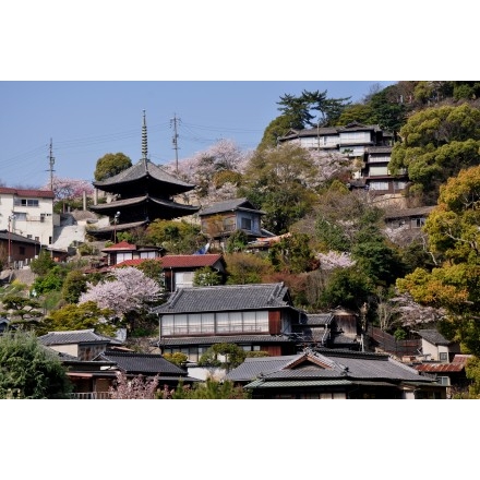 春の天寧寺三重塔とその一帯の風景です。甍と桜が美しいコントラストを作り出しています。