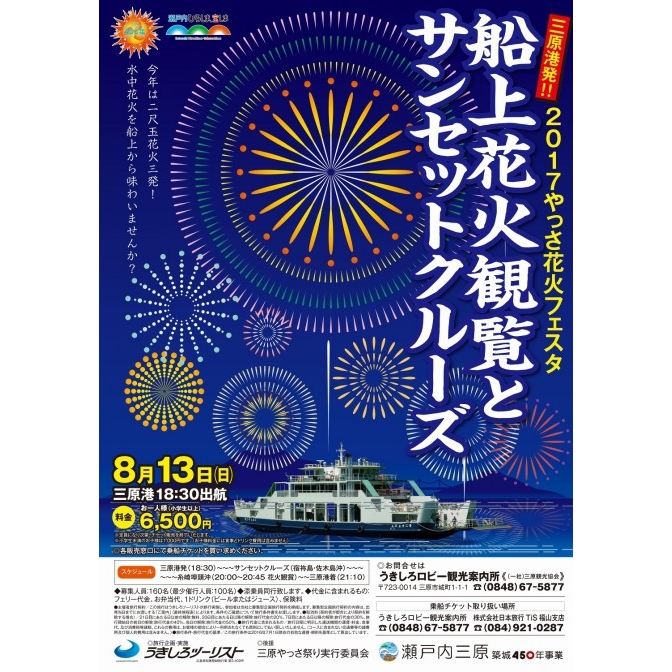 ホーム > イベントカレンダー > 【三原】2017やっさ花火フェスタ 船上花火観覧とサンセットクルーズ