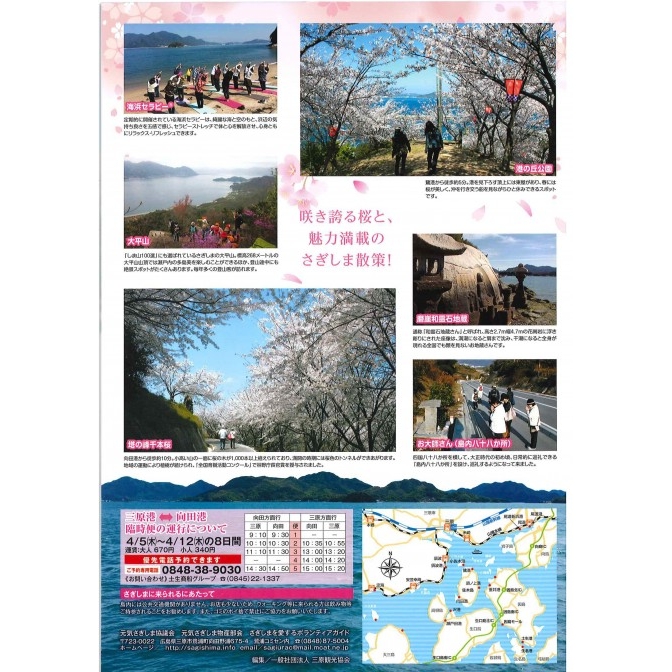 | 内容 | 三原市街地の沖に浮かぶ離島の佐木島は桜の名所としても知られています。ひとときの船旅を楽しんだのち、桜の咲き乱れる佐木島へ。過ごし方は人それぞれ。散策してもよし、何もしないでぼーっとした贅沢な時間を過ごすもよし。 期間中にはテント市も開催されます。 |