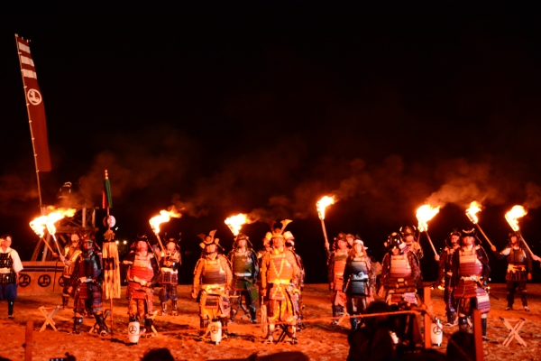 3部構成で行われる「因島水軍まつり」の第2弾「火まつり」。たいまつに照らさせた砂浜に水軍が陣を張り、鎧武者が堂々と入陣するする姿は圧巻です。