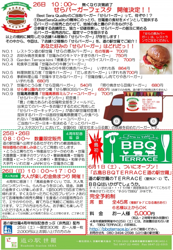 道の駅世羅の開業4周年を記念し、各地の道の駅の特産品の販売や、ご当地バーガー「せらバーガー」のフェスタ、しまなみ海道・やまなみ街道沿線のPRコーナー「しゃまなみ物産展」、「大人が楽しむ金魚まつり」など盛りだくさんの2日間です。