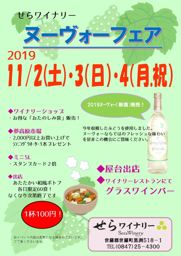 ワインの販売はもちろん、お得なお楽しみ袋の販売や、あたたかい和風ポトフの販売(1日60食限定)なども行われます。 -