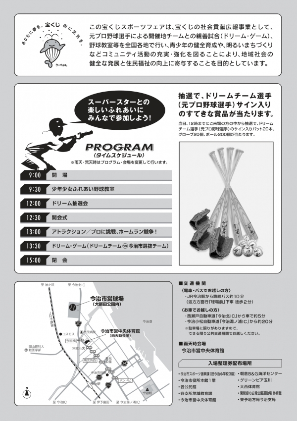 今治市選抜チームとの対戦や、子どもたちへの野球指導、選手のサイン入りバットやグローブが当たる抽選会などが行われます。