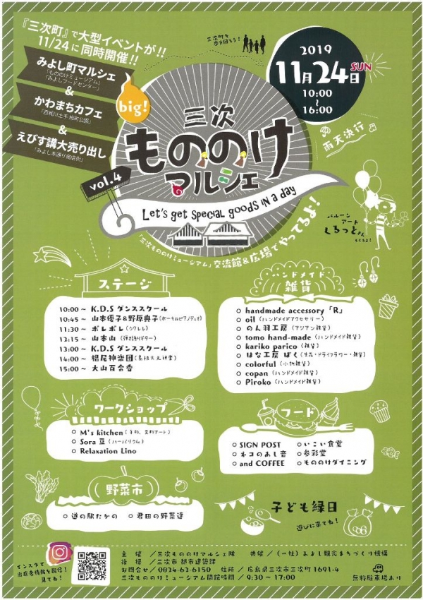 三次もののけミュージアムの交流館と広場を会場に、地元団体のステージをはじめ、ワークショップやハンドメイド雑貨の販売、子どもも楽しめる縁日などが繰り広げられます。