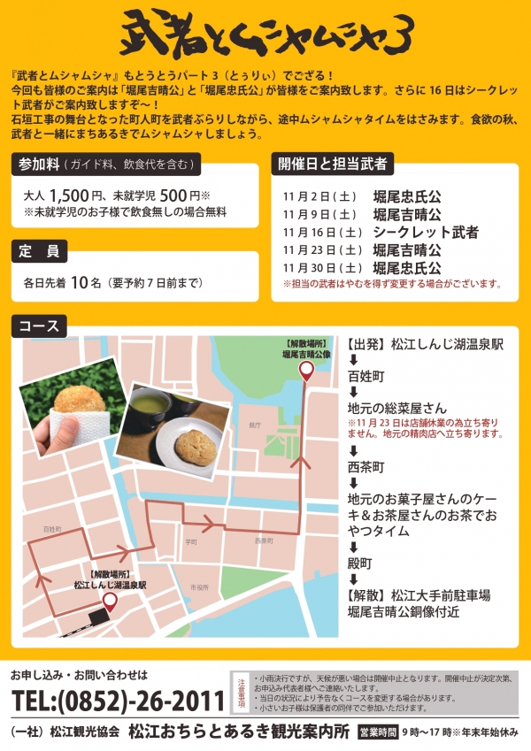 武者のいでたちをしたガイドの案内で松江の街なかを巡ってみよう。コースの途中では地元のお総菜屋さんやお茶屋さんなどを巡る「ムシャムシャタイム」もお楽しみください。