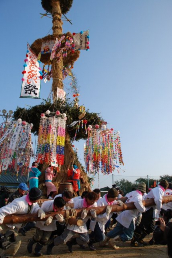 竹原市の二窓地区に400年も前から伝わる新春行事です。竹や機で組まれた高さ約20mもの新明さんに火を着け無病息災などを願います。