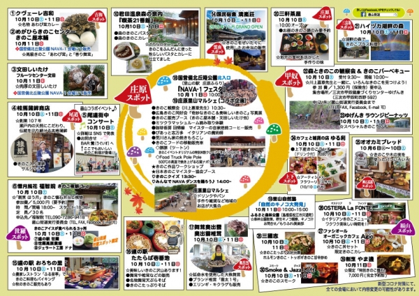 やまなみ街道沿線をはじめとする広域のエリアでキノコを食べたり、学んだり、体験したりしながらキノコと人とのつながりを考えるイベントが開催されます。 -