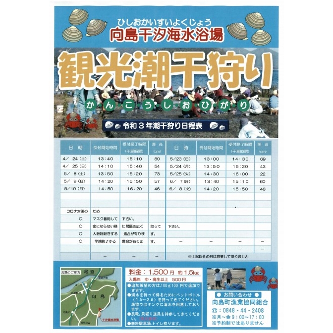 | 内容 | 今年も向島 干汐海水浴場の潮干狩りができます。 無料駐車場あり。潮干狩りの道具(長靴、バケツ、熊手など)はご持参ください。 マスクを着用の上、間隔を広くとってください。 人数制限や早期終了する場合もあります。 5月23日~25日、6月7日~6月8日は営業中止です。2021年の営業は終了しました。 2021年4月~6月の指定日 【4月】24日、25日 【5月】8日~10日、 【6月】 ※上記以外の日は営業しておりません。 ※長靴、貝掘りの道具一式は持参ください(素足厳禁) ※海水をもちかえるため、ペットボトル(1~2L程度)を持参ください ※トイレあり |