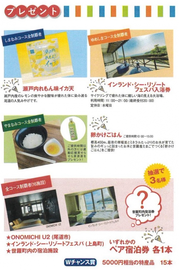 各コースごとに完走すると参加賞をGETできるほか、全コースを制覇した方には抽選で宿泊券や各町の特産品などもあたるチャンス!
