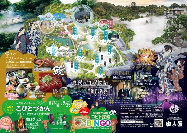 広大な日本庭園が光と霧に包まれ水墨画のような幻想的な空間を作り出します。夏の日差しの中でも涼やかな霧のミストが楽しめます。