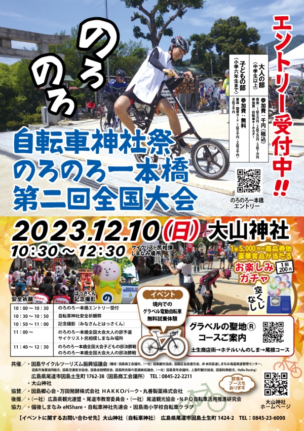 のろいが勝ち!!「のろのろ一本橋」を中心に、「安全祈願祭」や「尻相撲」「1等5,000円分商品券他豪華賞品が当たるお楽しみガチャ(1回:200円)」「飲食等の出店」「グラベル電動自転車無料試乗体験」「はっさくんと記念撮影」など盛りだくさん。