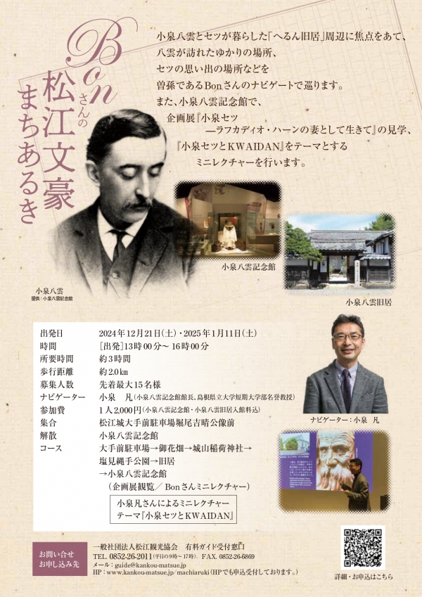 小泉八雲とセツが暮らした「へるん旧居」周辺に焦点をあて、八雲が訪れたゆかりの場所、セツの思い出の場所などを曽孫であるBonさんのナビゲートで巡ります。また、小泉八雲記念館で、企画展『小泉セツ—ラフカディオ・ハーンの妻として生きて』の見学、『小泉セツとKWAIDAN』をテーマとするミニレクチャーを行います。