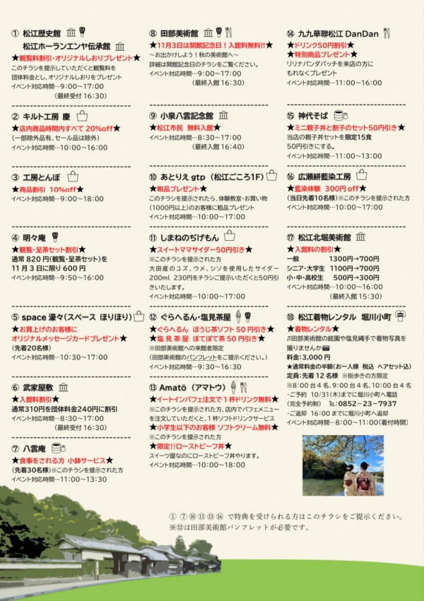 あとりえgtp(松江ごころ1F)/Amato/神代そば/九九華聯DanDan/キルト工房 慶/ぐらへるん・塩見茶屋/小泉八雲記念館/工房とんぼ/しまねのぢげもん/space濠々/田部美術館/広瀬絣藍染工房/武家屋敷/松江北堀美術館/松江着物レンタル 堀川小町/松江歴史館・松江ホーランエンヤ伝承館/明々庵/八雲庵