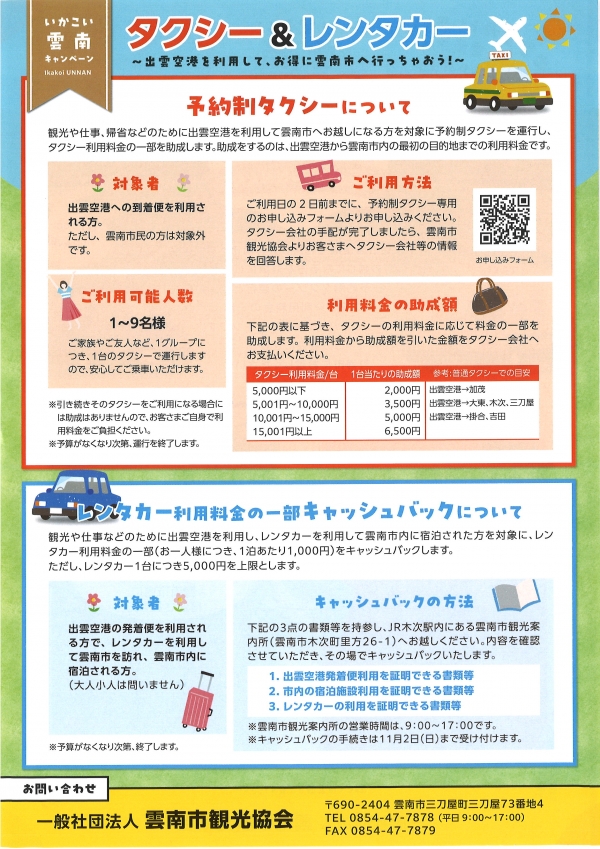 出雲空港を利用して雲南市へお越しになる方を対象にした予約制タクシーの運行と、レンタカー利用料金の一部キャッシュバックキャンペーンです。
