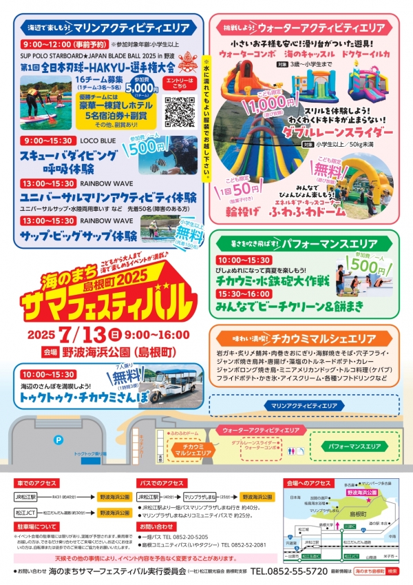 マリンアクティビティエリア、パフォーマンスエリア、ウォーターアクティビティエリア、マルシェエリアの4つのブースがあり、子どもから大人まで海で楽しめるイベントが盛り沢山!