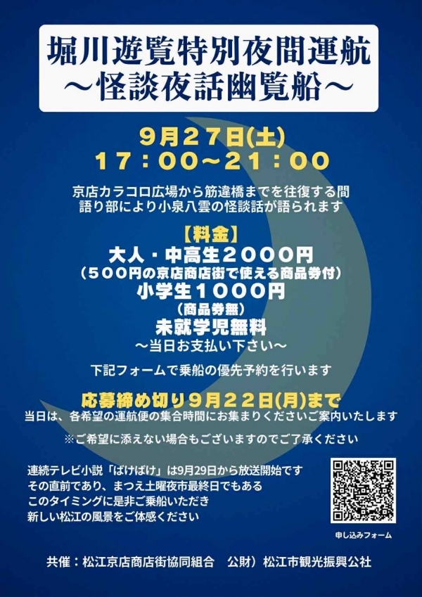 今年の「まつえ土曜夜市」の最終日、京店カラコロ広場から筋違橋までを往復する間、語り部により小泉八雲の怪談話が語られる幽覧船を特別運航します。
