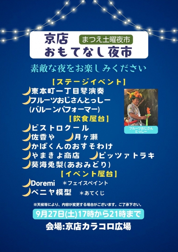 京店カラコロ広場では、ステージイベントや屋台などが登場!ゆっくり夜市をお楽しみください。 -