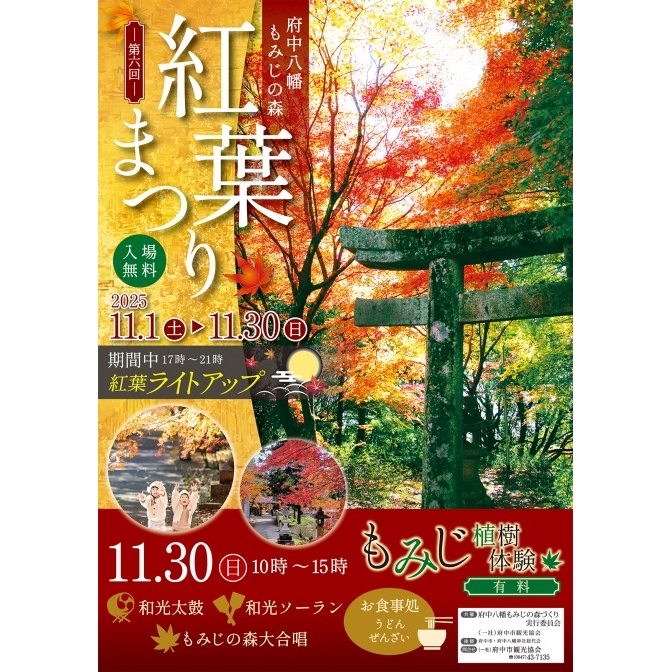 内容 | 11月1日から30日までの期間中、府中八幡の森がライトアップで幻想的な紅葉色に染まります 11月30日(日)は、太鼓やソーラン、大合唱などのイベントも盛り沢山。 この日限定のお食事処では暖かいうどんやぜんざいを提供します。 秋の府中をお楽しみください。 |