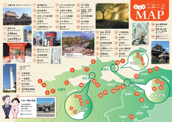 (松江市内のスポット:神魂神社、八重垣神社、大雄寺、月照寺、小泉八雲旧居、普門院、城山稲荷神社、国宝松江城・ギリギリ井戸跡、来待ストーン) グーグルマップで見る -