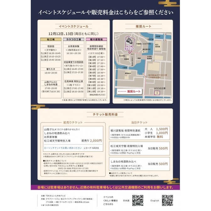 | 内容 | 冬の山陰ならではの食と伝統文化を五感で楽しむ特別な夜。 国宝松江城では、夜間入場や夜の天守での怪談夜語り、地酒・山陰グルメのふるまいを実施。 カラコロ工房では、石見神楽上演、お茶席体験。 カラコロ広場では、堀川遊覧船(冬のこたつ船)怪談夜語りを楽しめます。 |