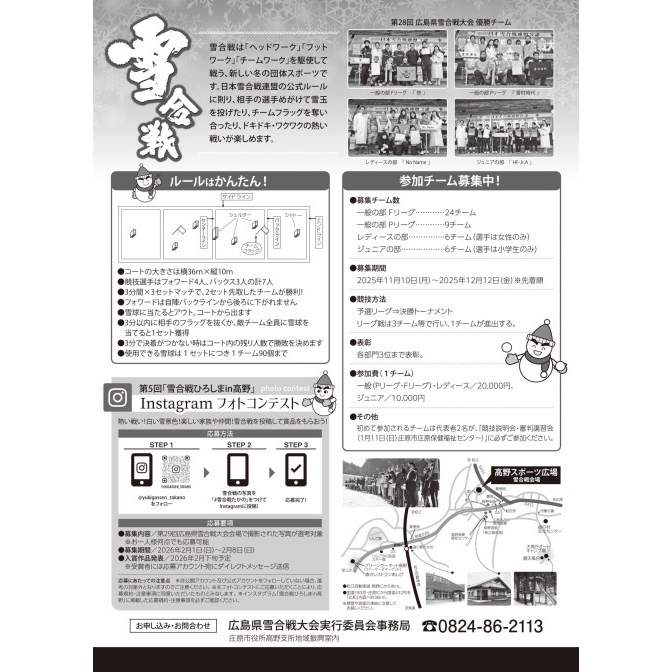 | お問合せ先 | 広島県雪合戦大会実行委員会事務局(庄原市役所高野支所地域振興室内) TEL 0824-86-2113 |
