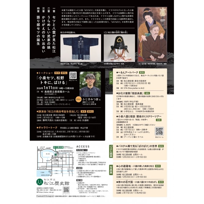 | 内容 | 松江歴史館で開催される企画展「連続テレビ小説「ばけばけ」の世界と小泉セツと八雲の時代」関連イベント 下記の4ヶ所に設置された重ね押しスタンプを押すと絵柄が完成!どんな絵柄ができるかはお楽しみに。 ・松江歴史館 ・カラコロ工房 ・島根県立美術館 ・武家屋敷 全て巡ってスタンプが完成したら、オリジナルグッズ”怪談ふせん”を先着1,000名様にプレゼントします。 【グッズ配布について(先着)】 ・配布場所:松江歴史館 ・配布時間:12月26日(金)~4月5日(日) 9:00~17:00 ※ただし、毎週月曜日(※祝日の場合は翌平日)、年末年始(12月29日~1月1日)は除く。 ※グッズ配布は、お一人様につき1回限りとさせていただきます。 |