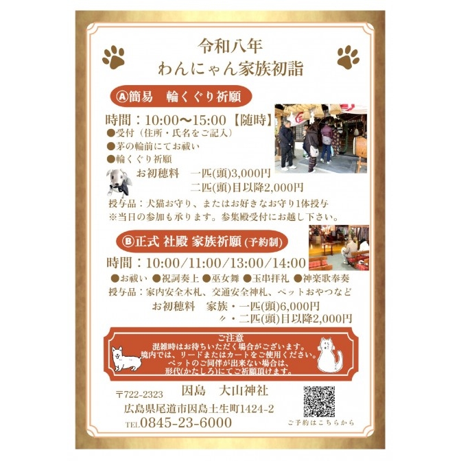 | 内容 | 大山神社にて開催される【わんにゃん家族初詣】は、ペットも大切な家族の一員として、心静かに新年のお参りをしていただく神事です。 わんちゃん・ねこちゃんと一緒にご参拝いただけます。 なお、同伴が難しい場合は、形代(かたしろ)にてご祈祷をお受けいただくことも可能です。 |
