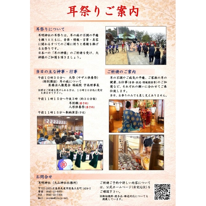 | 内容 | 耳の病や不調の平癒を願うとともに、音楽・放送・言葉・美容など「耳」に関わるすべてのご縁に祈りと感謝を捧げるお祭りです。境内では「お多福耳くぐり」や特別講話、サザエ供養祭、耳祈願、人形供養祭、奉納演芸などが執り行われます。 耳に不安のある方はもちろん、ご家族の健康や仕事のご加護を願う方も、どうぞご参拝ください。 ※内容は変更となる場合があります。 |
