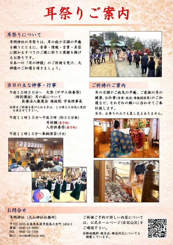 耳の病や不調の平癒を願うとともに、音楽・放送・言葉・美容など「耳」に関わるすべてのご縁に祈りと感謝を捧げるお祭りです。境内では「お多福耳くぐり」や特別講話、サザエ供養祭、耳祈願、人形供養祭、奉納演芸などが執り行われます。